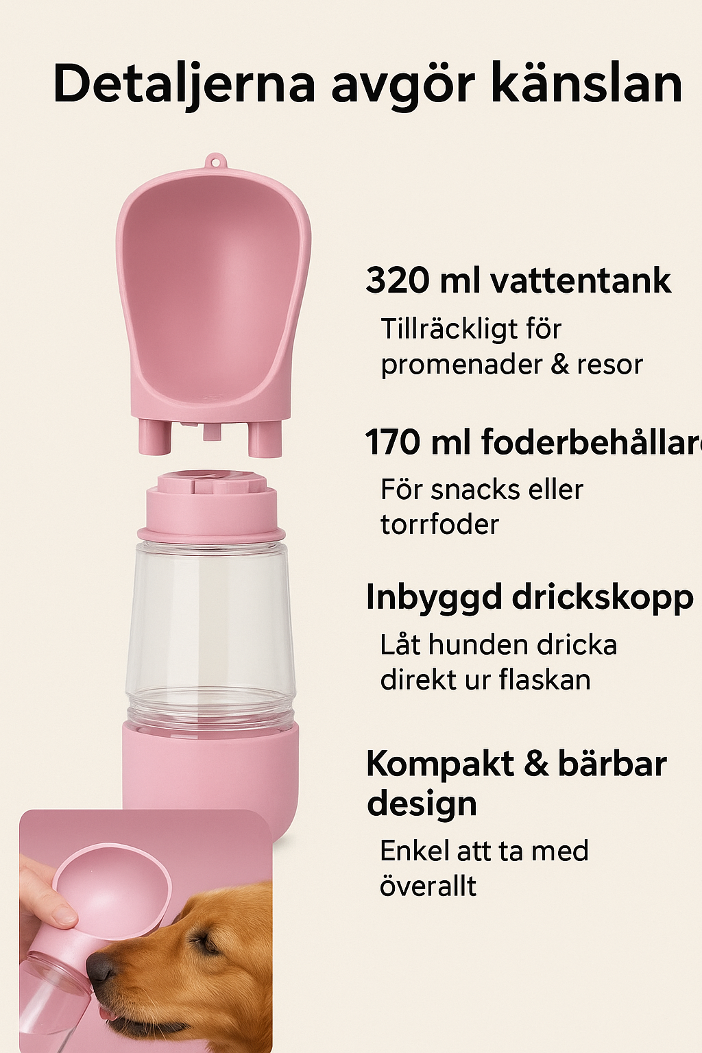 Denna smarta 2-i-1 flaska kombinerar funktion och bekvämlighet i perfekt balans. Med en vattentank på 320 ml har du alltid friskt vatten nära till hands, och den separata foderbehållaren på 170 ml ser till att snacks eller torrfoder alltid finns redo. Den inbyggda drickskoppen gör det enkelt för hunden att dricka direkt ur flaskan, medan den kompakta designen gör den lätt att bära med på promenader, resor eller utflykter.